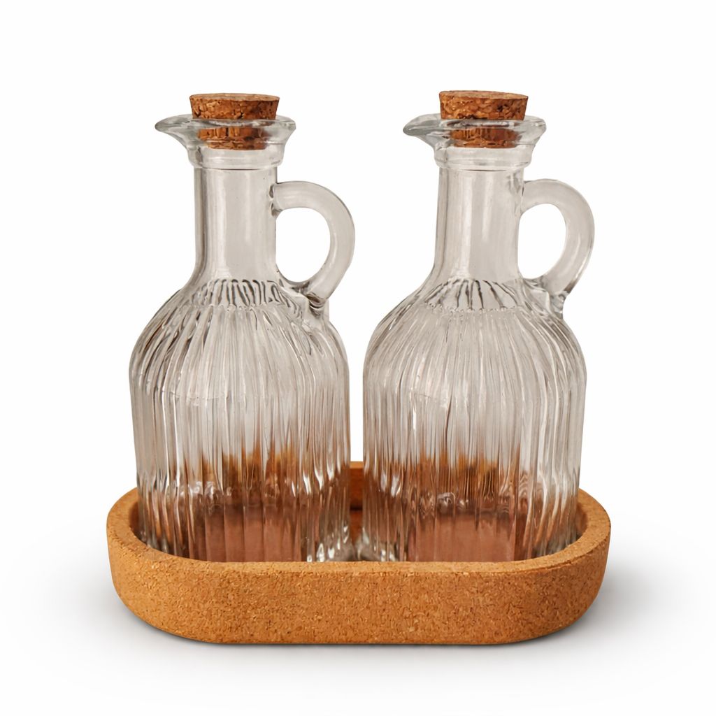 Apportez une touche authentique et raffinée à votre table avec ce duo de bouteilles en verre strié, doté de bouchons en liège naturel et présenté sur un support assorti. Idéales pour l’huile, le vinaigre ou les sauces, elles allient praticité et esthétisme pour un service soigné au quotidien.