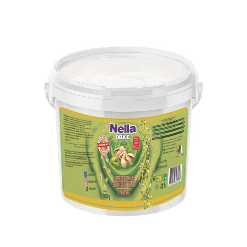 NELLA DELICE Crème de pistaches grillées avec éclats et kadaïf (cheveux d’anges) pot de 1 Kg idéal pour vos desserts et préparation chocolat de Dubaï.