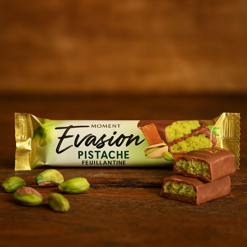 MOMENT Evasion Barre chocolatée pistache et feuillantine 37 gr, vendue seule ou par lot de 6×37 gr.