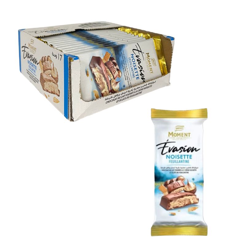 MOMENT Evasion tablette de chocolat noisette et feuillantine 95 gr, vendue seule ou par boîte de 17 tablettes.