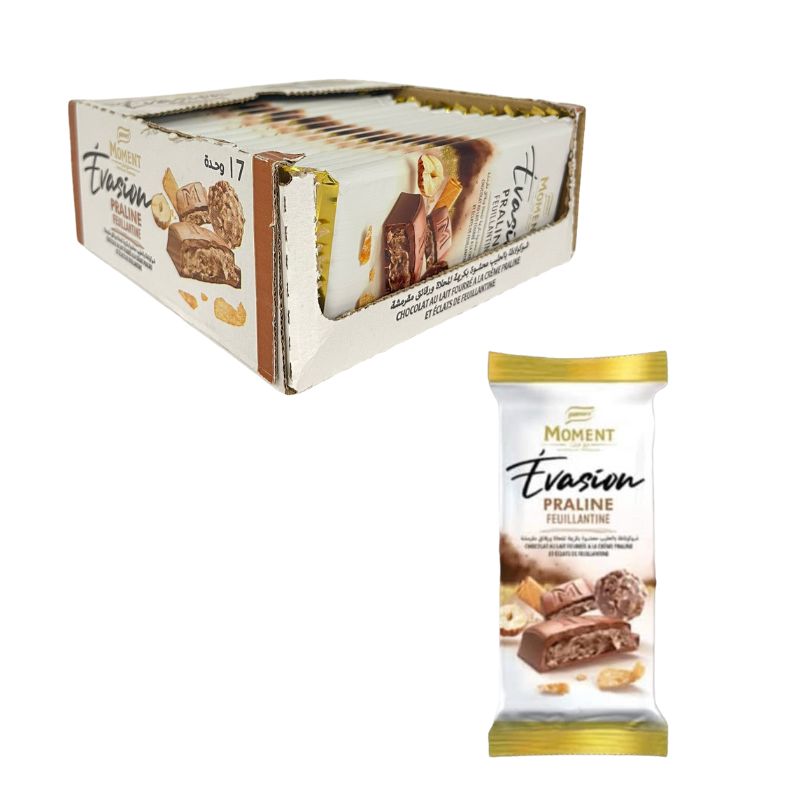 MOMENT Evasion tablette de chocolat pralinée et feuillantine 95 gr, vendue seule ou par boîte de 17 tablettes.